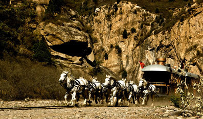 电影《让子弹飞》剧照。其实马拉火车的事情曾经真实发生在唐山和胥各庄之间的铁路上。